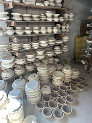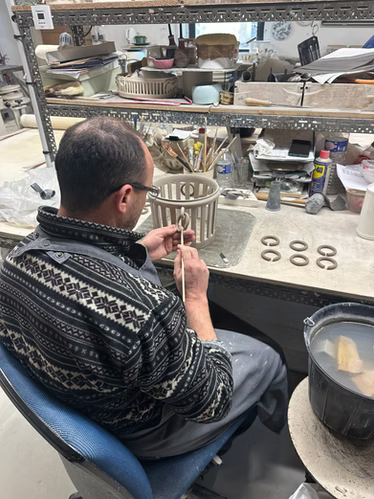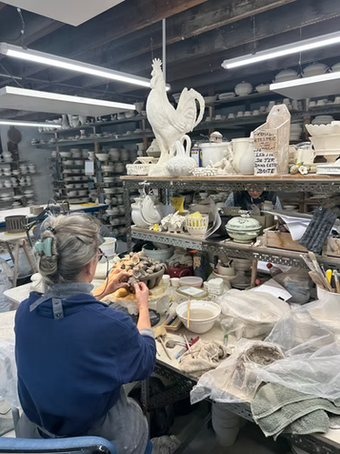 Other objects are formed by a process called stamping, in which the craftsman takes rolled out clay, and gently presses it into a plaster mold, resulting in the clay taking its form.